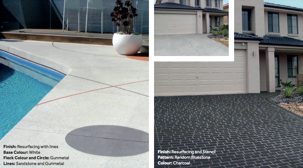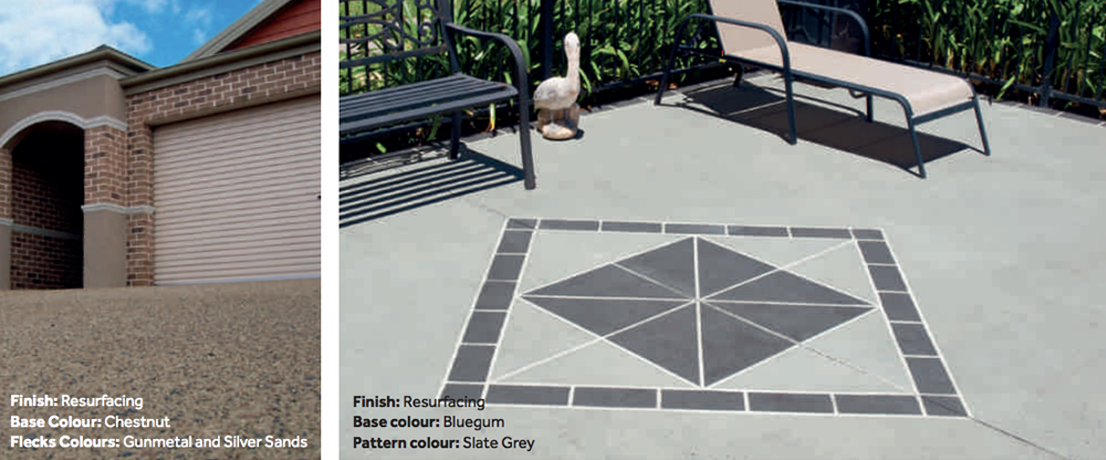 Transform your existing concrete surfaces to a designer finish. With concrete resurfacing you can add colour, patterns and detailed designs to your existing concrete surfaces. It is ideal for rejuvenating your driveway, outdoor entertaining areas, steps, paths and patios. There is a huge variety of colour combinations and patterns available including the popular fleck spray which allows you to customise the colour and finish to suit your home.