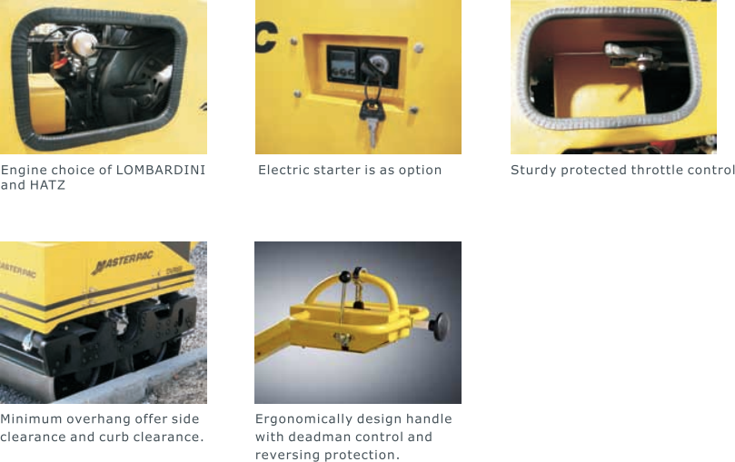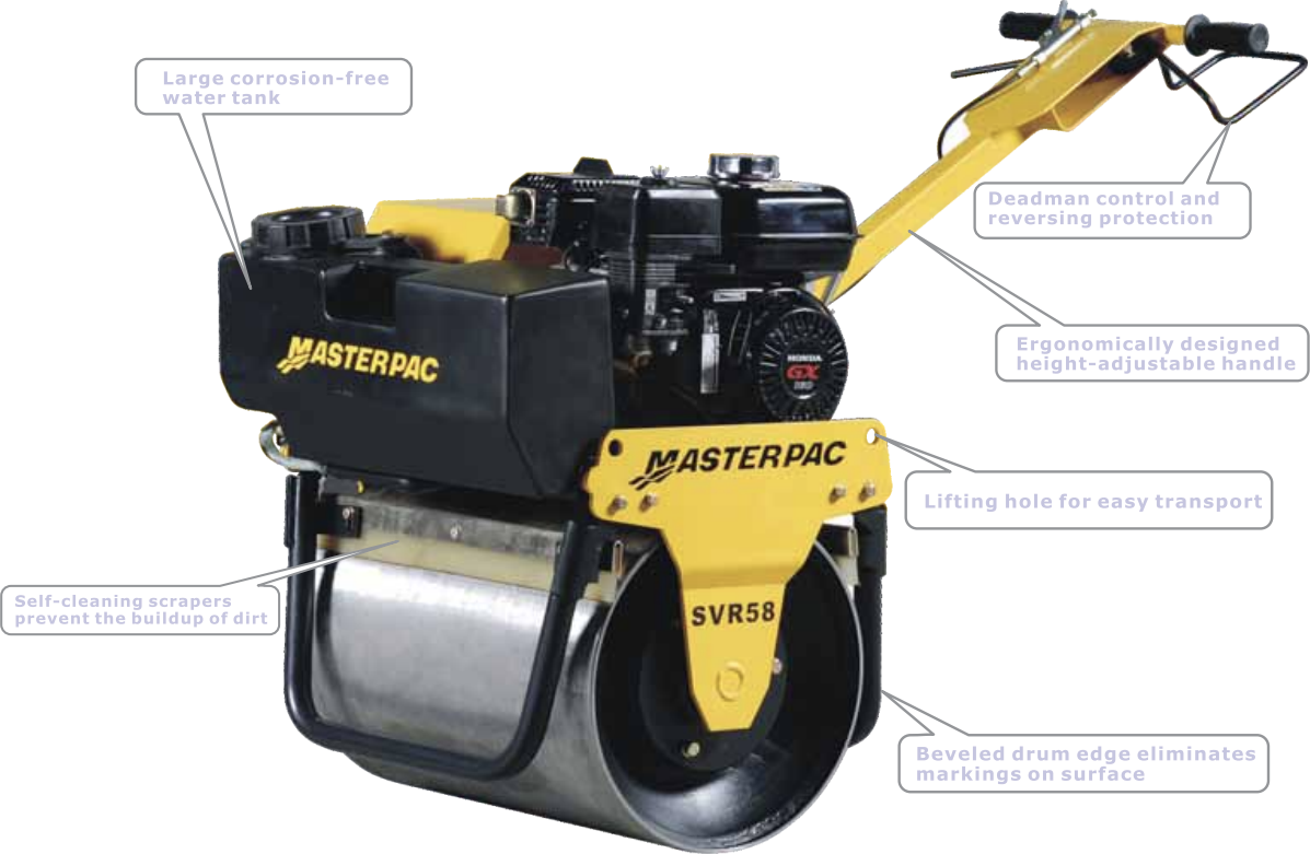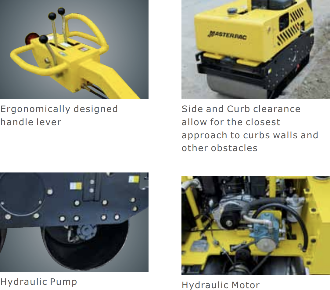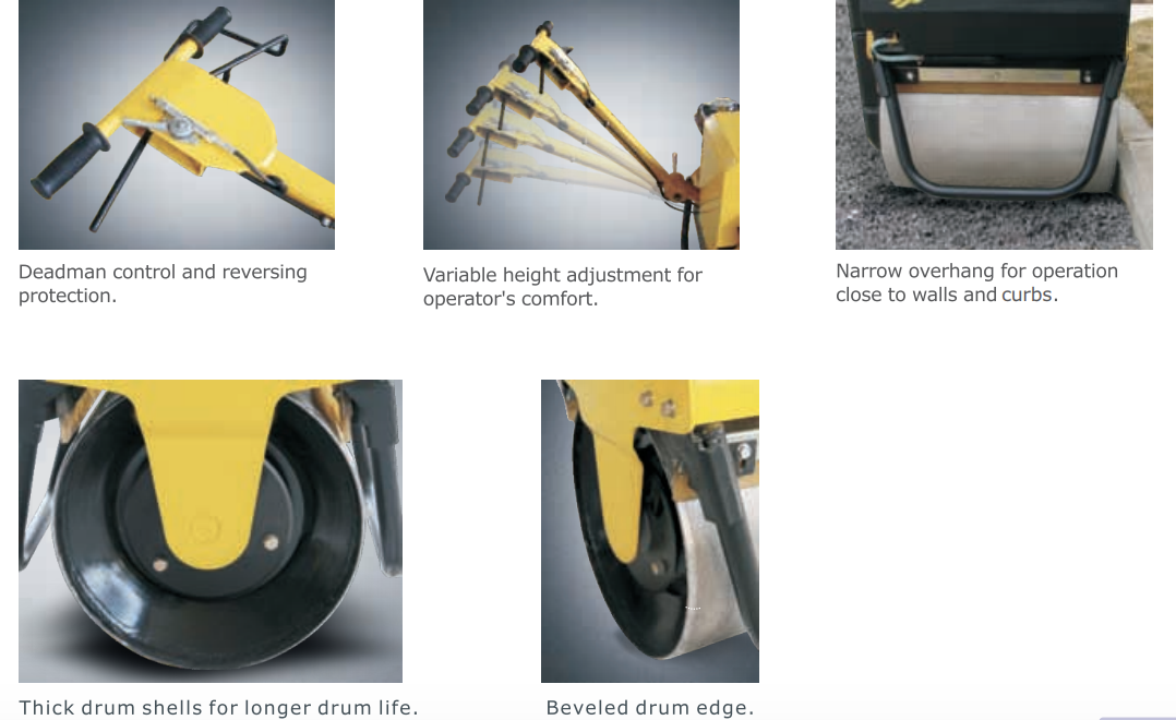 - Dual smooth drums with beveled edge eliminates mark on the ground and asphalt.